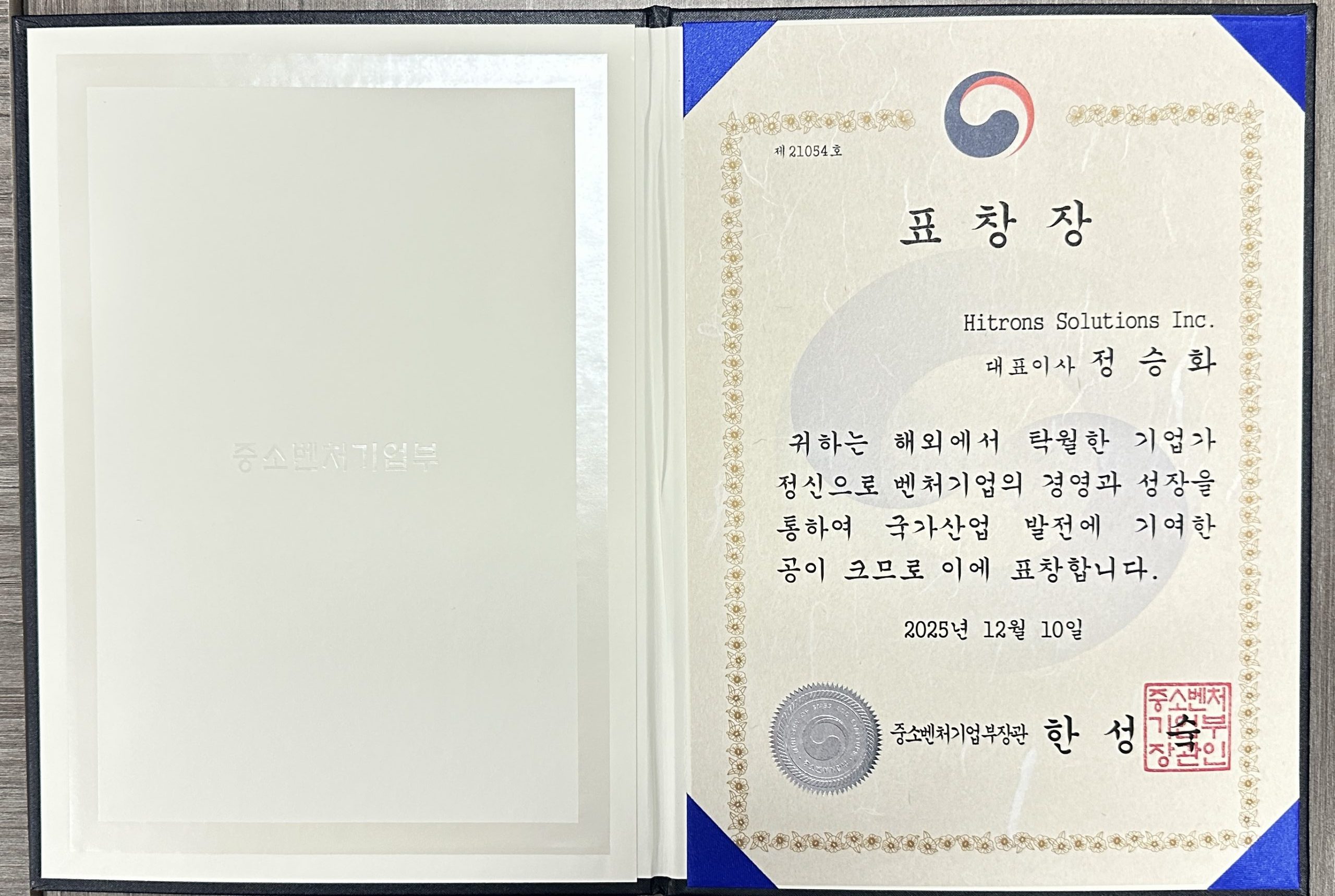 본사 정승화 대표는 벤처기업의 경영과 성장을 통해 국가산업에 기여한 공로가 인정되어 2025년 12월 10일 표창장을 받았습니다.