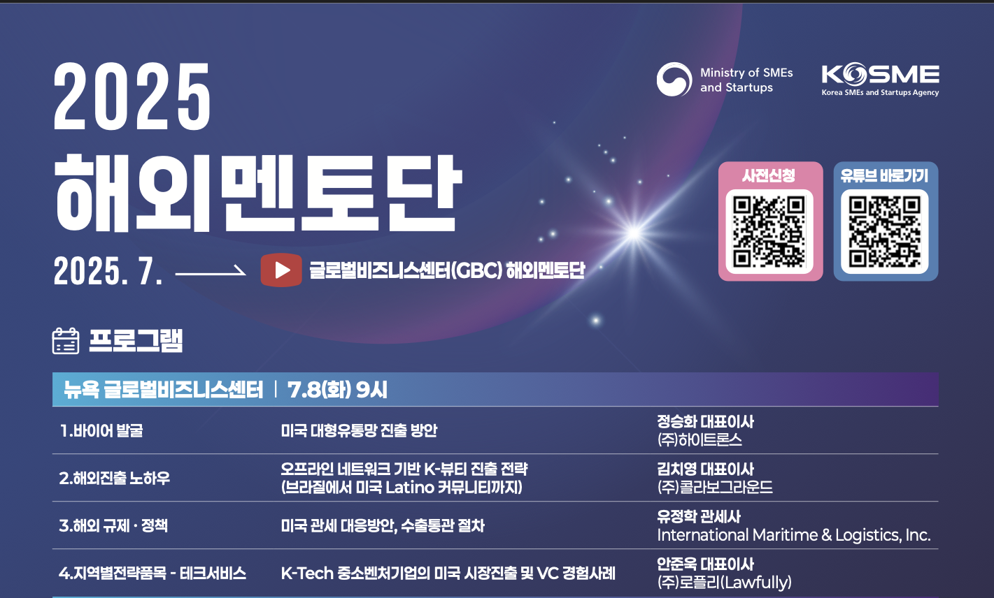 중소벤처기업부와 중소벤처기업진흥공단은 수출 중소기업을 대상으로 미국 관세 대응, 해외 진출, 수출국 다변화 등에 대한 실질적인 정보를 제공하는 ‘2025 해외멘토단’ 프로그램을 7월 8일부터 운영하고 있습니다.