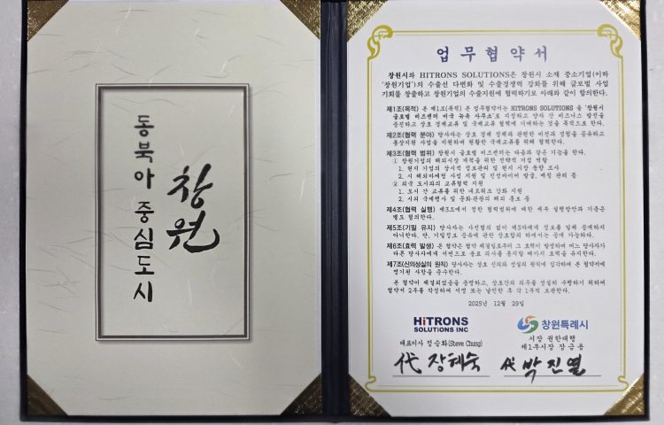 경남 창원시는 29일 수출 컨설팅업체인 ‘HiTRONS SOLUTIONS'(미국)을 글로벌 비즈센터로 지정하는 업무협약을 했다고 밝혔다. 시는 북미 현지 산업·시장에 대한 전문성을 갖춘 이들 두 업체를 글로벌 비즈센터로 지정해 창원지역 기업의 해외 진출을 지원하도록 한다.…